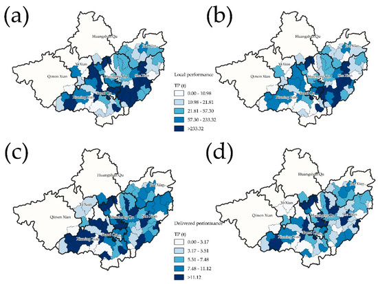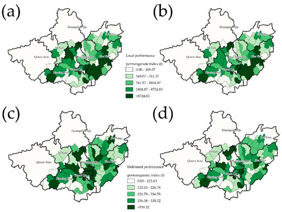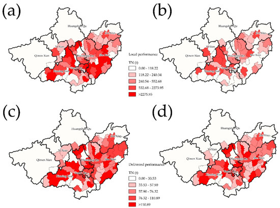 In Figure 4, Figure 5 and Figure 6, we found that the local and delivered performance in XAJ1 was better than that in XAJ2; it was more difficult to make much improvement in the areas which had already made improvements. From 2012 to 2017, in the perspective of the net amount, the environmental performance of CODMn was the best, with the average amount of 7283.32 t and 346.95 t of local performance and delivered performance, respectively. The environmental performance of TN was the second, with the average amount of 73.40 t and 1659.66 t of local performance and delivered performance, respectively. The environmental performance of CODMn was the best, with the average amount of 7.41 t and 167.53 t of local performance and delivered performance, respectively. The local performance was focused on the main pollution area (She Xian and Tunxi Qu), while the delivered performance shows more spatial distribution.