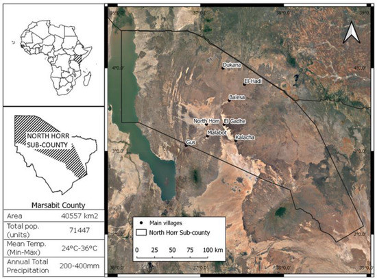 The area covered by this study (Figure 1) is North Horr Sub-County (Marsabit County) in the northeastern region with a particular focus on the surrounding area of eight main villages.