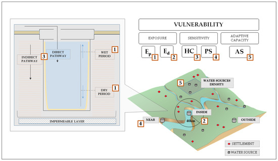Figure 2 presents an overview of the vulnerability assessment model describing the sub-indicators taken into consideration for the construction of this quantitative vulnerability analysis. As previously mentioned, nitrate contamination of open shallow water sources is a climate-driven issue since the wet periods activate contamination pathways and dry periods reduce the contaminant-to-solution ratio (1). The maximum number of settlements, potentially using the water source, is introduces as a two-way sub-indicator considering the exposure of these settlements and the pressure they bring on water sources (2). Moreover, as highlighted by the literature on the topic, nitrate contamination can occur through direct or indirect pathways (3), therefore sub-indicators of lateral and vertical hydraulic conductivity are taken into consideration. The location of the open shallow water sources (inside, outside or near the stream) (4) is introduced as a sensitivity factor while the adaptation strategies are evaluated through the water sources density (5).