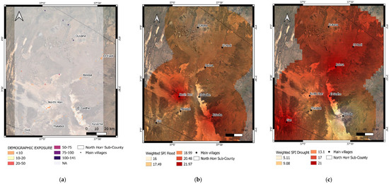 Exposure sub-indicators: (a) demographic exposure, (b) physical flood exposure, and (c) physical drought exposure.