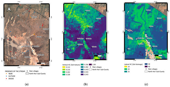 Sensitivity sub-indicators: (a) presence of the stream, (b) soil texture, and (c) soil drainage.