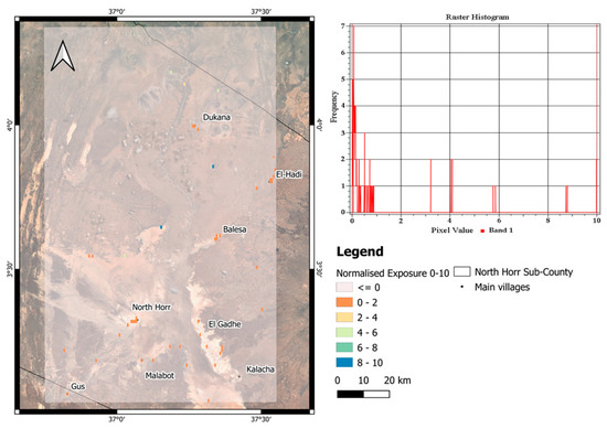 The water sources in the surroundings of Dukana show a higher weighted number of settlements and therefore these are the most exposed areas in North Horr Sub-County (see Figure 3a). Some water sources in the western part of the sub-county have a medium demographic pressure. The rest of the water sources are less stressed.