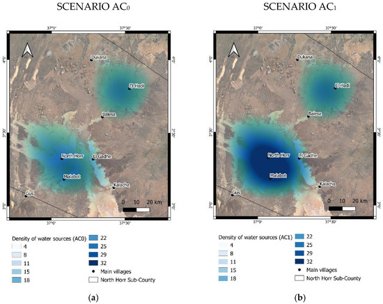 Compared to the current adaptation scenario (AC0), the implementation of the actions stated in the SCIDP will move to a future adaptation scenario (AC1). Therefore, two adaptation scenarios were constructed (AC0 and AC1) where the water sources density in the project area is used as proxy of the sub-indicator of the walking distance to water sources as suggested by [70]. The AC0 scenario, thus, represents water source density ante-SCIDP and the AC1 scenario represents water source density (i.e., ante-SCIDP water sources plus new water sources planned) post-SCIDP.