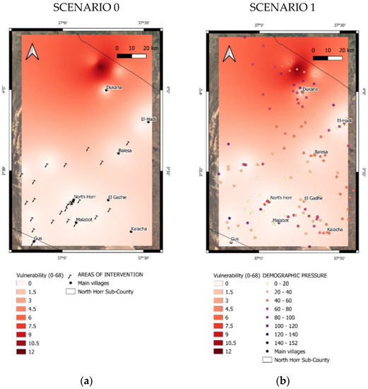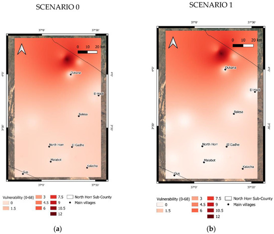 The result showed that the values of vulnerability in Scenarios 0 and 1 are greater in the northern part of the sub-county (dark red areas) with respect to the southern part (white to light red areas). Very few changes occurred from Scenario 0 to Scenario 1.