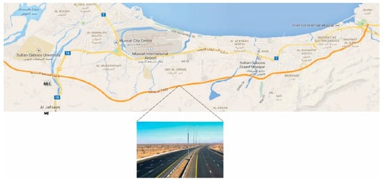 Since the previous studies [1,33,34] have shown that incidents have no significant effects on traffic flow during off-peak hours and the main objective of our study was to evaluate ATM strategies to resolve non-recurrent congestion, our models needed to be tested during peak hours [33,34]. The urban planning for the study area showed that Mubella is a residential area in Muscat, and most ministry buildings and companies are located in Alkhwaire and Al Quram. Consequently, the route between Mubella and Quram (North to South) sustains heavy traffic congestion during the morning peak hour (when the people go to work), while the route between Quram and Mubella (South to North) has heavy traffic congestion during the evening peak hour (when they come back to their homes) [33,34]. Therefore, our strategies were evaluated during the morning peak hour on the route between Mubella and Qurum and during the evening peak hour on the route between Qurum and Mubella.