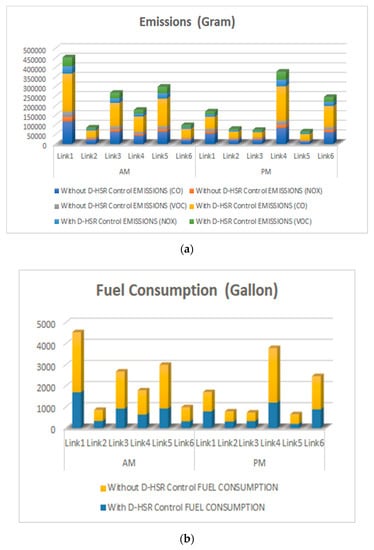 - The fuel consumption and emissions decreased during a.m. and p.m. hours by 44.5% and 41.5%, respectively. The environmental impact of using D-HSR is shown in Figure 4.