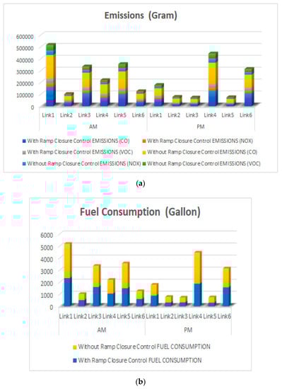 Figure 5. Environmental impact of using dynamic ramp closure (D-RC): (a) emissions; (b) fuel consumption.