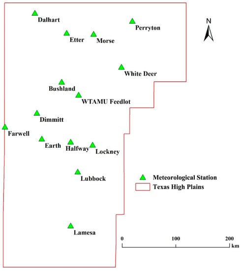 Long-term (1995–2014) climatic variable data across the THP were collected with the Texas High Plains Evapotranspiration (TXHPET) network (Table 1) []. The network of agro-meteorological stations was designed and installed with the purpose of collecting weather measurements for calculating standardized reference evapotranspiration (ETo) values for regional crop irrigation management. Station locations were established in the TXHPET network to represent the major irrigated crop production areas within the region. These values were used in conjunction with planting date-specific crop coefficients for estimating daily crop evapotranspiration (ETc) values for major crops, which were subsequently used for irrigation scheduling by producers within the region []. The climate data from the TXHPET network were made available daily to producers via fax initially, and later through a website and e-mail listserv. Station siting was designed to adequately represent regional differences in climate with producers using data from the nearest or most representative station. Each research-grade, agro-meteorological station was maintained in accordance with the American Society of Civil Engineers-Environmental and Water Resources Institute (ASCE-EWRI) specifications [] and maintained with a quality assurance/quality control (QA/QC) program. All the agro-meteorological stations were situated in sites with well-maintained, cool-season perennial grass. The grass was well irrigated and mowed to a height of three inches to six inches (76 to 152 mm). Data integrity was also confirmed at a regular interval.