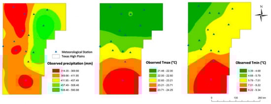 According to the spatial maps, the western part of the THP had lower observed average annual precipitation (2000–2009) than the eastern region (Figure 2). The observed average annual precipitation showed an increasing gradient from the west to east in the THP (Figure 2). The average annual precipitation amounts ranged from 314 to 591 mm across the THP. As for the average annual air temperatures, the northern part of the THP had lower observed maximum temperature than the southern region, while the northwest region exhibited lower minimum air temperature compared to the southeast region (Figure 2). The northernmost agro-meteorological station at Dalhart (36°20′ N) has a clearly different latitude compared to the southernmost Lamesa station (32°47′ N) (Figure 1). The average annual maximum and minimum air temperatures varied from 21.5 to 24.2 °C and 3.4 to 9.3 °C, respectively, across the THP.