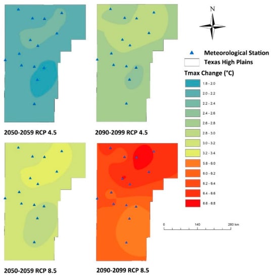 The semi-arid Texas High Plains (THP) in the United States (U.S.) was formed as a result of alluvial sediment depositions brought by rivers that originated from the Rocky Mountains [,]. The THP is a relatively treeless, agricultural and rangeland dominant, and windy region []. It is one of the most intensive agricultural regions in the world, and cotton (Gossypium hirsutum L.) is a major crop grown in the THP region. The cotton planting area is approximately 32% of the U.S. total in 2019 []. Corn (Zea mays L.) is the major irrigated crop, and several counties in the THP have reported the largest average corn yields in the nation []. The potential climate change phenomena of increased temperatures and decreased precipitation can be the most important threat in the agricultural sector affecting the semi-arid THP. For instance, the increase of future temperatures can cause a reduced maturity period of corn, which could decrease time duration of corn to use solar radiation and assimilate CO2 and adversely influence the accumulation of corn biomass and final yield [,,,]. Climate change adaptation, such as alternative planting dates, land use change, and stress tolerant cultivars, can be time-consuming and costly. However, advance study and planning will be beneficial in mitigation of the adverse impacts of climate change. Therefore, assessing climate change trends under current and future climate scenarios enables not only the development of best agricultural management practices (BMPs) with potential adoption rates and strategies in the future, but also the awareness, preparation, and precautionary actions of possible associated environmental issues.