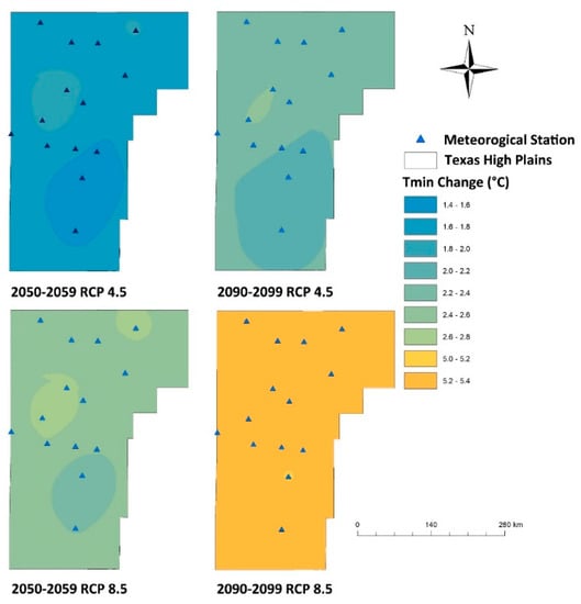 Agricultural production in the Texas High Plains (THP) relies heavily on irrigation and is susceptible to drought due to the declining availability of groundwater and climate change. Therefore, it is meaningful to perform an overview of possible climate change scenarios to provide appropriate strategies for climate change adaptation in the THP. In this study, spatio-temporal variations of climate data were mapped in the THP during 2000–2009, 2050–2059, and 2090–2099 periods using 14 research-grade meteorological stations and 19 bias-corrected General Circulation Models (GCMs) under representative concentration pathway (RCP) scenarios RCP 4.5 and 8.5. Results indicated different bias correction methods were needed for different climatic parameters and study purposes. For example, using high-quality data from the meteorological stations, the linear scaling method was selected to alter the projected precipitation while air temperatures were bias corrected using the quantile mapping method. At the end of the 21st century (2090–2099) under the severe CO2 emission scenario (RCP 8.5), the maximum and minimum air temperatures could increase from 3.9 to 10.0 °C and 2.8 to 8.4 °C across the entire THP, respectively, while precipitation could decrease by ~7.5% relative to the historical (2000–2009) observed data. However, large uncertainties were found according to 19 GCM projections.