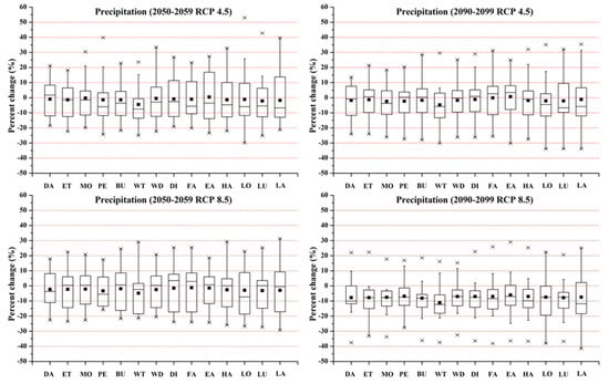 Box plots of precipitation change (%) under the RCP 4.5 and 8.5 scenarios compared to the historical (2000–2009) observed data; DA, ET, MO, PE, BU, WT, WD, DI, FA, EA, HA, LO, LU, and LA indicate Dalhart, Etter, Morse, Perryton, Bushland, West Texas A&M University Feedlot, White Deer, Dimmitt, Farwell, Earth, Halfway, Lockney, Lubbock, and Lamesa.