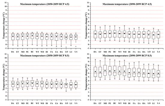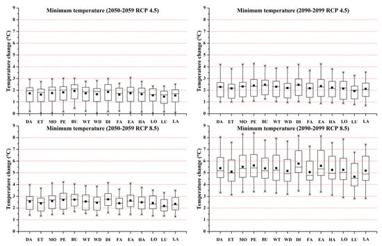 As for air temperature, the maximum air temperature increased from −1 to 4 °C, 0 to 5 °C, 1 to 5 °C, and 4 to 10 °C under the 2050–2059 RCP 4.5, 2090–2099 RCP 4.5, 2050–2059 RCP 8.5, and 2090–2099 RCP 8.5 scenarios, respectively, according to 19 GCM predictions (Figure 7). The average values of maximum air temperature for those scenarios elevated ~2.0, 2.8, 3.0, and 6.5 °C. However, there is a large uncertainty depending on the GCM used, particularly for the severe emission scenario at the end of this century (Figure 7). All 19 GCMs projected an increase in the minimum air temperature in the future. The minimum air temperature could increase by 0 to 3 °C and 1 to 4.5 °C in the middle (2050–2059) and the end (2090–2099) of the 21st century under the RCP 4.5 scenario (Figure 8). A greater increase in minimum air temperature was identified under the RCP 8.5 scenario. Specifically, the air temperature increase shifted from 1.5 to 4.0 °C and 3.0 to 8.5 °C in the time periods of 2050–2059 and 2090–2099 using the 19 GCMs (Figure 8).