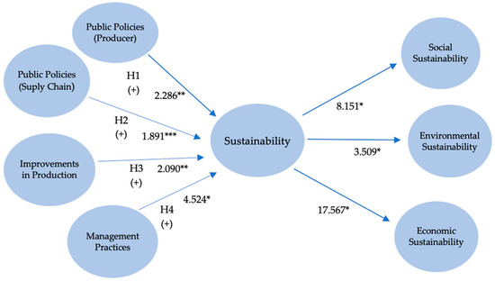 Figure 1 shows the results of the structural equation model obtained from the measurement of sustainability as a second-order variable, represented by the first-order factors of social, environmental and economic sustainability. It is proven that the studied drivers really explain strongly and positively the second-order variable of sustainability. They are also important variables for measuring sustainability from a Triple Bottom Line perspective (see Table 4). Further, the results of t-statistics tests indicate that the most important driver of sustainability in dairy activity is the use of good management practices. It should be noticed that public policies aimed directly at rural producers and improvements in production techniques also contribute positively to sustainability. Nevertheless, public policies directed towards the supply chain do not have a strong effect on the sustainability of dairy farming.
