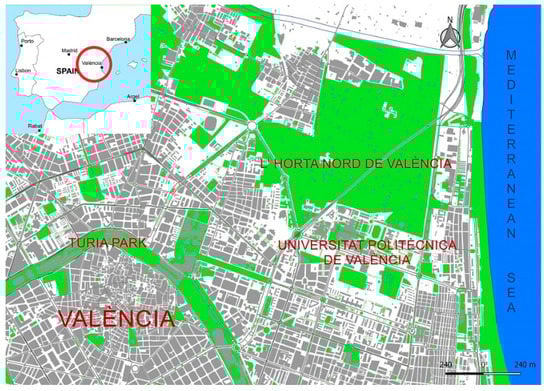 The study area is the campus of the Universitat Politècnica de València, a Spanish public university located in Valencia (Figure 1). Valencia is the capital of the autonomous community of Valencia and the third largest city in Spain, after Madrid and Barcelona, with around 800,000 inhabitants. Valencia is located on the Spanish Mediterranean coast on an alluvial plain, formed through a repeated depositional sequence of the Turia River. This city has a Mediterranean climate with long, hot, and dry summers and mild and wet winters [17].