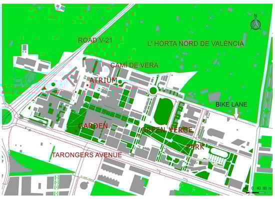 The campus of Universitat Politècnica de València covers almost 57 hectares. Approximately 22% of the total surface area of the campus is occupied by green space. More than eighty buildings, around 87% of the built-up area, are situated around Plaza Agora, considered the heart of the university [18]. The campus is situated in the neighbourhood of L’Horta de València and is the new northern urban limit of the city and a transitionary space between urban and rural environments (Figure 2). L’Horta de València forms a unique landscape integrated into a well-known Mediterranean orchard. This singular agricultural system was declared a protected landscape and part of the city’s cultural heritage [19,20] and has been recently (2019) recognised as a Globally Important Agricultural Heritage System (GIAHS) and as a 1200-year-old productive farming system, in which agricultural and hydraulic heritage and culture are integrated [21].