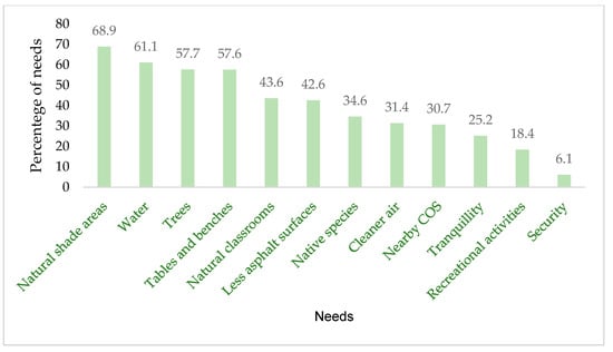 An average of five needs were observed. More than 50% declared that natural shade, water, trees, tables, and benches were the main deficiencies related to COS (Figure 4).