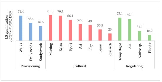University community members perceived eight LS provided by COS as having good quality, with values over 50%. In descending order, they were: get together with friends or meet up, walks, relax, temperature/light, air quality (AIR), sport, daily basic needs (DAILY NEEDS), and art creation (ART) (Figure 5).