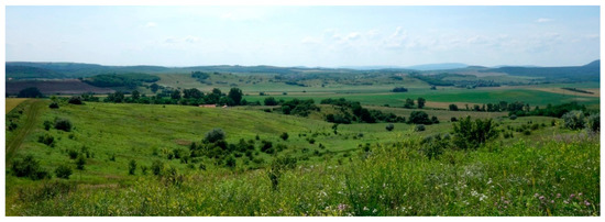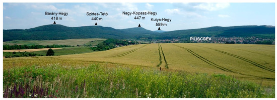 The Dorog Basin (hung. Dorogi-medence), built of sands, loess, and loess clays, occupies most of the area. The Piliš Mountains (hung. Pilis), part of the Dunazug Mountains, belong to the Transdanubian Central Mountains (hung. Dunántúli-középhegység), which is formed by limestone and dolomite rocks [65] (pp. 147–148). The studied area’s altitudes range from about 163 m (floodplain of the Čív brook in the northwest of the area) to 418 m (Barina hill, or Barány-hegy). The erosion-denudation georelief of the Dorog Basin has a hilly character with steeper slopes and valleys (Figure 2 and Figure 3).