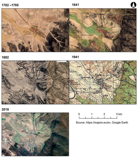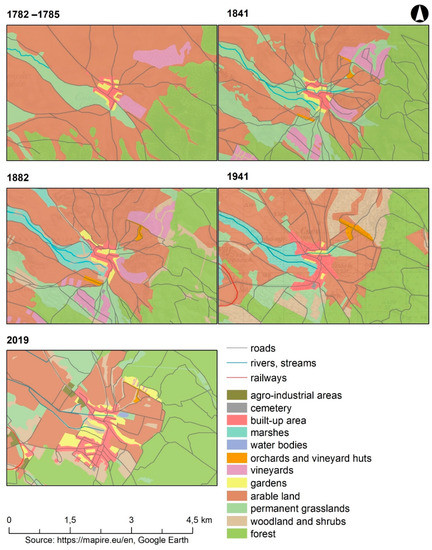 The origin, or, more precisely, the anthropogenic transformation of the natural landscape into a cultural landscape in space and time must be understood in the interaction of both characteristics. The research needs to choose a historical landscape at a specific time horizon and emphasize its stability, development, and changes compared to the previous period, which are visualized by the authors’ scheme (Figure 7), whose time horizons can be imaginarily identified with the selected stages in the years 1782 to 2019 in the area.