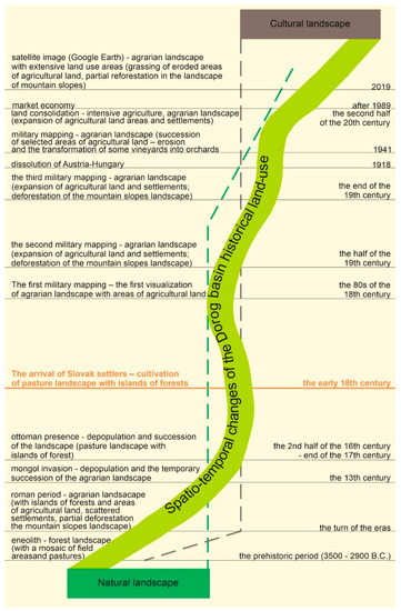 Visual reconstruction of prehistorical and historical land use of the Čív landscape in the geographical area of the Dorog basin is clearly presented in the author’s scheme of the spatio-temporal axis (Figure 6).