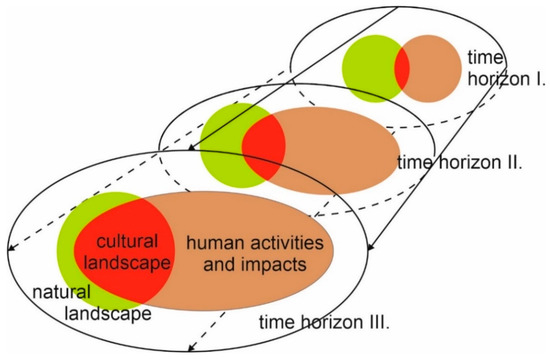 Visualization of man and the natural landscape interaction in time (in different time horizons) leading to the expansion (respectively to the emergence) of the cultural landscape and the defined (researched) territory. Source: authors’ research