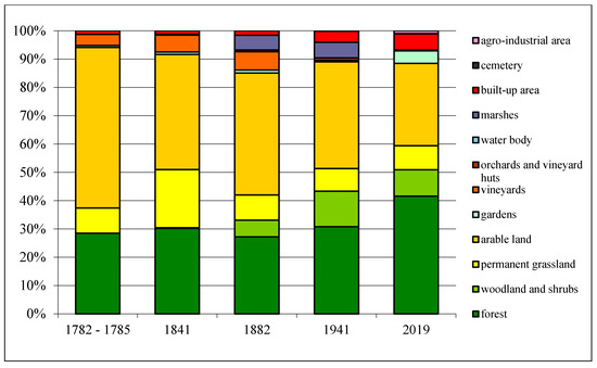 Development of land use classes (LUC) of the studied area in the years 1782/1785–2019.