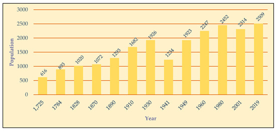 In 1732, Veľký Čív had 236 adults, of which were 26 peasants and 12 cotters [89] (p. 17), [92] (p. 18). The Theresian land-register from 1768 provides a general view of the representation of specific LUCs and the intensity of land-use in the studied area in the late 1960s [94] (pp. 263–265). During this period, the name of the village was Čív (hung. Csév). The document in Čív states 59.75 peasant settlements with an area of approximately 7000 ha. A total of 128 heads of families lived in the village in 1767.
