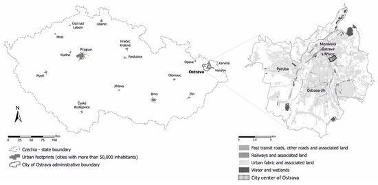 Ostrava is an old-industrial, medium-sized city in Czechia, Central Europe, with approx. 286,000 inhabitants [61]. Over the last two centuries, Ostrava developed as a polycentric city with a fragmented urban structure. The city of Ostrava has witnessed persistent population loss since 1990 (a decrease of nearly 14%) and although deindustrialization is considered a main cause of the shrinkage, the city still retained its specialization in traditional industries [62]. Rather than unemployment, the air pollution resulting from industrial activity is currently one of the strong push-away factors which led to suburbanization and outward migration to the capital city (Prague) [62,63].