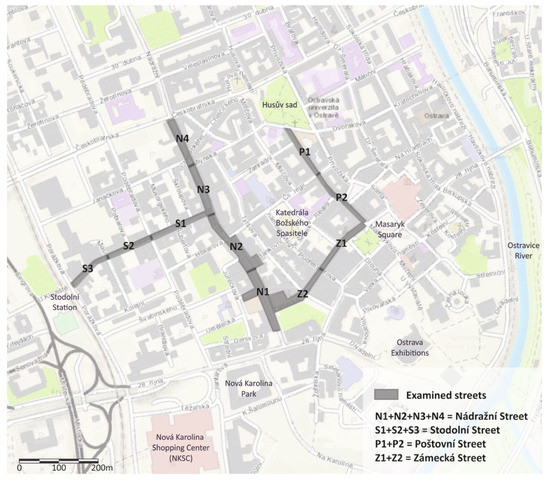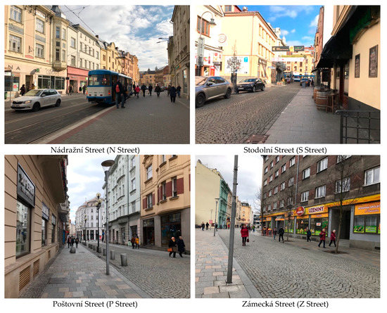This research is exploratory in purpose. Four main streets in the city center of Ostrava (Figure 2) were purposefully selected as case studies, to investigate the attractiveness for walking in real-life settings [74]. Based on preliminary observations, these streets have high concentrations of small commerce and attract the highest amounts of human activities in the city center of Ostrava. They are historically-significant and have architectural and urbanistic value.