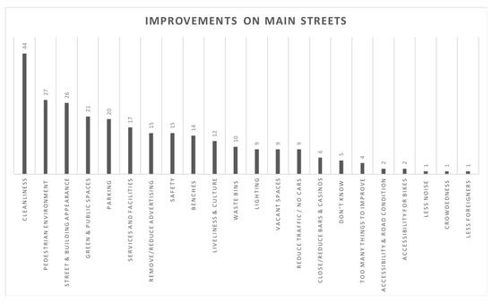 Although many respondents did not express an opinion about improvements (28%), the five most frequently mentioned issues concerned overall: cleanliness; the condition of sidewalks and the pedestrian environment; the street appearance and the building conditions in terms of their architecture and decorations; the quantity and quality of green and public spaces; and the issue of parking for either being too much, too little, or inconvenient. Some respondents further mentioned the need to improve the quality of services and facilities by adding new cafes, restaurants and gastronomic businesses, as opposed to bars and casinos. Removing or reducing advertising was also suggested. Other mentions can be seen in Figure 4.