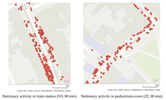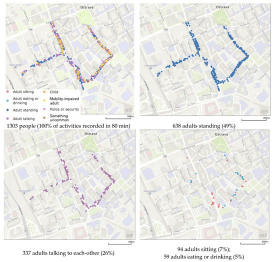 One limitation of our study could be that we recorded pedestrian activities in November (2019), but mostly in sunny days with average temperatures of 10 °C. Summer temperatures of over 20 °C can attract slightly more stationary activity; nevertheless, our results are representative for pedestrian activity in non-rainy days at autumn, or even at spring. Overall, however, both the pedestrian counts and the records of stationary activities are far below the walkway capacity defined in the Highway Capacity Manual [86] or in the Czech Technical Norm [87]. This was encountered even in the busier parts of Ostrava’s main streets (which were the tram stops on N street). Hence, in Ostrava it is hardly an issue of a low pedestrian level of service, but it is primarily an issue of depopulating streets.