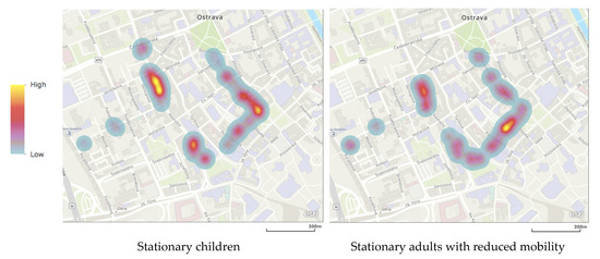 Figure 6. Heatmap based on the numbers of children and mobility-impaired adults having stationary activities on the four streets.