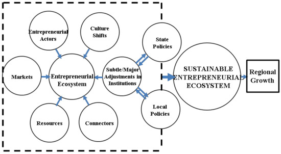 - O’Connor, A.; Stam, E.; Sussan, F.; Audretsch, D.B. Entrepreneurial Ecosystems: The Foundations of Place-based Renewal. In Entrepreneurial Ecosystems; O’Connor, A., Stam, E., Sussan, F., Audretsch, D., Eds.; International Studies in Entrepreneurship; Springer: Cham, Switzerland, 2018; Volume 38, pp. 1–22. Available online: https://link.springer.com/chapter/10.1007/978-3-319-63531-6_1 (accessed on 27 July 2020). [CrossRef]