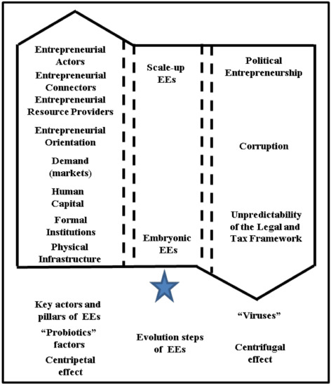 Usually, an entrepreneurial ecosystem appears at random; several conditions must occur simultaneously: a friendly environment, local facilities, a spark of innovation, and/or a lucky initiative. As it was already shown, “an entrepreneurial ecosystem consists of all elements that are required to sustain entrepreneurship in a particular territory” [54] (p. 5).