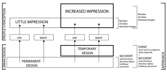 In this study, the events imply temporary design, which is defined as specifically and purposely time-limited [14] design intervention [13]. Although the temporary design has been given increasing attention, and has become more integrated in urban planning and design practices over time [15,16,17], it tends to be considered apart from traditional or permanent design, as “provisional” or “secondary” [18]. Temel notes, “…it shares qualities with the provisional, but temporary also has its own qualities use and should not be viewed as merely a substitute for the fully adequate”. [19]. This study investigates the impact of the temporary design on the pedestrians’ perception in relation to permanent design to emphasize the critical role of the temporary design with a focus on how this could contribute to a stronger impression of urban design, particularly, public open spaces in winter cities.