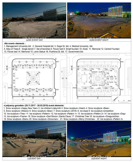 At the initial stage, the digital map of the urban elements was prepared for the “no event” and the “event” for both the day and night situations on Lenin Square. All the urban elements were labeled with numbers according to their position. Four scenes in Lenin Square were observed, for the “no event” on 24th February of 2018, and for the “event” on 19th of February during the daytime and at night when the urban elements were well-lit (Figure 2).