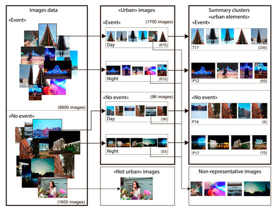The analysis of the content of the images involved three main steps: selecting the images related to the urban design issue, defining the clusters of the urban elements and labeling the summary clusters. We collected data for two equal periods on a number of days. For the “no event” periods (1–24 November 2017 and 20 February–15 March 2018) we collected 1600 datasets, while for event period (25 November 2017–19 February 2018), 8600 data sets were collected. Later, the data were classified according the whether the image represented indoor or outdoor content— “not urban” and “urban”, respectively. This is a critical stage since only 10% [55] of the content data relates to the urban design issues as a rule.