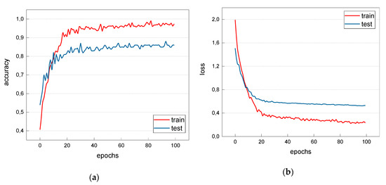 We trained data on the top 9 classes consist of different urban elements (Table 1) and the general class of “not urban” images to verify that CNN has potential to cluster the “urban” images. The training parameters are shown in Table 1. The verification of the data showed the accuracy of the training data are over the 0.9 (Figure 4a), while the loss was reduced to below 0.3 (Figure 4b) using 100 epochs. This implies that transfer learning with pretrained CNN was successful in learning different urban elements’ features. Therefore, this method and trained model are applicable for use in similar studies.