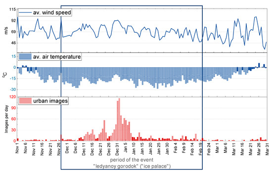 All of the data collected were images taken within 100 m of the geographic location of Lenin Square. We downloaded over 10,200 datasets (Table 2) of Instagram posts generated and shared during winter season when the temperature tends to be below 0 °C (Figure 5), from 1st November of the 2017 to 15th of March of 2018. It is clear that there was no relationship between the number of images posted and the weather parameters, such as the wind velocity (in m/s) and air temperature (in °C). However, A comparison of the patterns of the weather and number of images per day highlights the impact of the winter event on the people’s impression of the urban environment. This is true regardless of the severity of the climate, with low temperature ranging from 7 °C to–28 °C, according to Figure 5. While no images were posted on the “no event” periods, as many as 120 images were posted during the “event” periods. In addition, with the exception of the New Year holidays from 1st to 8th of January, there were between 10 and 60 images related to urban design per day, while during the “no event” period, that number was close to 0 (Figure 5).