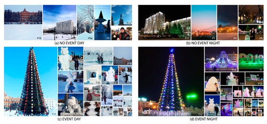 There were 8404 images related to “not urban” class, while there were 1796 “urban” images, representing 21% of all data. We divided the data into two situations for Lenin Square: the “no event” period, for images posted before (1–24 November 2017) and after the event (20 February 2018–15 March 2018); and the “event” period, for images posted from 25 November 2017–19 February 2018. From the 1600 images, 96 were related to the urban issues, representing 6% for the “no event” period. In case of the “event” period, an 8600-point dataset was collected, with 1700 “urban” images representing 20% of the total. The content in some of the images content was hardly recognizable or included the image of the whole square from the bird’s eye view, which made it difficult to relate to one urban element as the target object. These “urban” images were all classified as summary clusters. A total of 675 “urban” images were posted and generated during the “event” during the day, with 561 of the images related to “urban elements” clusters. Similarly, at night we collected 812 “urban” images: 708 of them were summary clusters of the urban elements. For the two “no event” periods, 53 and 36 images were related to urban design issues, while 30 and 35 images were summary clusters (Table 2).