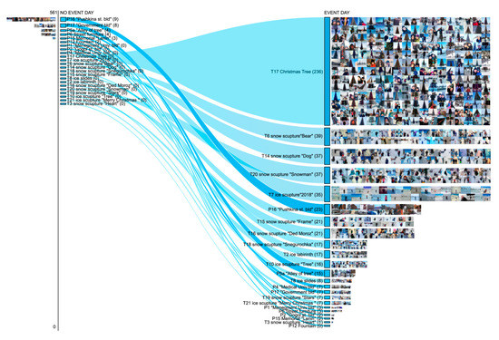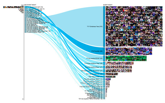 During the “event” period, a larger number of the images was related to the main temporary landmark, the Christmas Tree, both during the day and night. Moreover, there were many more images of some of the snow sculptures, including the “bear”, “snowman” and “dog” and the ice sculpture “2018”, than the other snow and sculptures temporary elements during the daytime. At night, another element appeared: the well-lit central fountain was the most common image, followed by ice sculpture “2018” and the snow sculptures—the “dog”, “bear” and “snowman” (Figure 6).