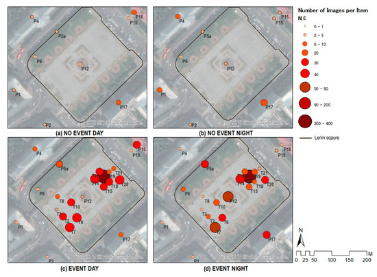 The event increased the number of impressions from 20 images to 400 images per urban element. Pedestrians perceived the permanent urban elements as clearly symmetrical, according the designated design classical composition. Comparing the day pattern of the “no event” and “event” periods, similar spatial patterns can be noticed during the day and at night for the images related to the permanent elements. For instance, the photographs captured the following element during the day: P16, P15, P5a, P4, P1, P2, P12, P17 and P6, with more images for P16 and P17 (Figure 9a,c). The other small-scale permanent elements are disregarded, including the side fountains, memorials and street furniture (Figure 2). Similarly, at night, the following appeared in images: P16, P15, P5a, P4, P1, P2, P12. P17, P6, with more images for P17 (Figure 9b,d).