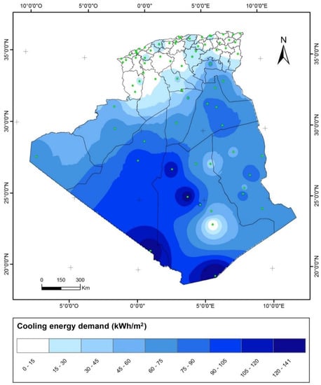 | Cooling energy demand range (kWh/m2) | 0–15 | 15–30 | 30–45 | 45–60 | 60–75 | 75–90 | 90–105 | 105–120 | 120–141 |