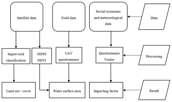 Supervised classification was carried out using the maximum likelihood method for each image separately. Land use/cover was classified into six different categories. The delineated classes were settlements, surface water, sand, wetlands, bare soil/road, bare area, and grassland in 1989, 1993, 1998, 2003, 2008, 2013, and 2018. During these years, data were used for land cover classification in August of each year. For each of the predetermined land cover/use type, training samples (ground truth data) were selected by delimiting polygons around representative sites. Spectral signatures for respective land cover types derived from satellite imagery were recorded by using the pixels enclosed by these polygons. UAV data were used for validation on each classification of lake water area. Training samples were collected using UAV and handheld GPS. We measured the ground control point with GPS at the same time that pictures were taken with the UAV. Supervised classification techniques, such as the maximum likelihood, were applied to the panoramic image to generate a land use and land cover map for the study area.