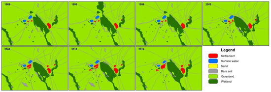 A classified land use/cover map of Avarga Toson Lake area between 1989 and 2018 is presented in Figure 3. The selected survey area was 6823 hectares. Land use was classified into seven categories. These were land cover types in 1989, 1993, 1998, 2003, 2008, 2013, and 2018 as settlements, surface water, sand, wetlands, bare soil/road, bare area, and grassland. Grassland accounted for between 83.1% and 85.4% of the total area, while the sand and water class, which was the area covering the least class, ranged from 0.03% to 0.1% and from 0.45% to 0.6%, respectively, during the 30-year period (Figure 3 and Table 3). The classification results in 1989, 1993, 1998, 2003, 2008, 2013, and 2018 are detailed in Table 3. The percentage of classes based on these results showed the land use/cover practices observed in Avarga Toson Lake area. The total area covered by grassland area for the year 1998 and 2018 were approximately 85.4% (i.e., 5824.8 hectares) and 83.4% (i.e., 5689.6 hectares), respectively. Settlements were found to have significantly increased—i.e., from 0.7% to 1.4% (47.0 hectares to 92.7 hectares)—within the 30 years. Sand areas increased by 0.03% (2.6 hectares) to 0.1% (6.5 hectares) within the 30 years. The bare areas (roads) increased from 4.9% (331.7 hectares) to 5% (402.1 hectares). The total areas of wetland for the year 1998 and 2003 increased from 8.5% (578.5 hectares) to 9.8% (671.2 hectares), while the surface water area reduced from 0.6% (38.4 hectares) to 0.4% (25.3 hectares).
