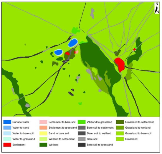 To evaluate the results of land use/cover conversions, land cover changes from 1989 to 2018 were also created and shown in Figure 4. A comparison of each class of 1989 and 2018 showed that there were a marked land use and land cover change over the 30 years. There were two kinds of trends— increasing and decreasing—that occurred in 1989–2018. An increasing trend of land use/cover change in the Avarga Toson Lake area changed by 0.07% for sand, 0.7% for settlement, 1.3% for wetland, and 0.01% for bare soil, while the classification results supported the aforementioned decreasing trend over the past 30 years by 0.2% of water and 2.0% of grassland from 1989 to 2018. Figure 4 further shows that about 2.0% of grassland converted to settlement, wetland, and bare soil land between 1989 and 2018. At the same time, water, settlement, bare soil, and wetland converted to grassland. The relatively large amounts of transformation were observed in grassland to settlement, wetland to grassland, and grassland to wetland.