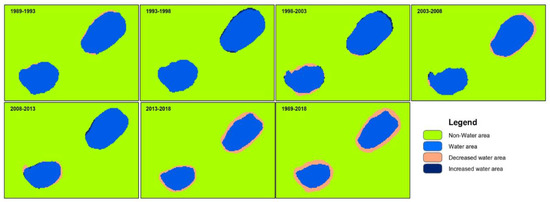 The changes of water surface area maps shown in Figure 5 and statistics shown in Table 4 were also generated from the aforementioned classified images. To evaluate the results on water bodies as Toson and Burd Lakes area conversions, the change maps were illustrated for 1989 to 1993, 1993 to 1998, 1998 to 2003, 2003 to 2008, 2008 to 2013, 2013 to 2018, and 1989 to 2018 (Figure 5 and Table 4). Table 4 observed that the Toson Lake water area changed (1.4%) between 1989 (16.1 ha) and 1993 (15.9 ha) and marginally changed by 12.5% from 1998 to 2003 and 21.1% from 2013 to 2018. The Burd Lake water area was constant between 1989 and 1998 (with about 22.3 ha). The water covering area significantly decreased by about 6.3% from 1998 to 2003 (20.9 ha), 11.9% from 2008 (22.7 ha) to 2013 (20.0 ha), and 23.5% from 2013 to 2018 (15.3 ha) during the 30-year period.