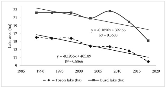Moreover, changes of the surface water area in the Toson and Burd lakes area are also shown in Figure 5. These results indicated that during the twenty nine-year period (i.e., 1989–2018, Figure 6), the area of Toson Lake was shown to mainly decrease. Increased cases were obtained for Burd Lake from 1993 to 1998, 1998 to 2003, and 2008 to 2013, while significantly decreasing changes occurred between 2013 and 2018. The classification indicated that Toson Lake covered 16.1 ha area and Burd Lake 22.3 ha in 1989, and these areas reduced to 10.0 ha for Toson Lake and 15.3 ha for Burd in 2018. Thus, the areas of Toson Lake and Burd Lake diminished by 21.1% and 23.5%, respectively, within 30 years.