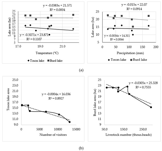 Figure 7 describes the relationships between lake water area and climate variables. The correlation analyses showed that among the meteorological station data near Avarga Toson Lake area, the water area had the weakest and most positive correlation with temperature (R2 = 0.11 for Toson and R2 = 0.0004 for Burd) and precipitation (R2 = 0.006 for Toson and R2 = 0.09 for Burd). Thus, it did not show an affecting indicator between lake area and climate variables. In contrast, Toson Lake area was most strongly correlated with number of visitors (R2 = 0.89). Burd Lake area was also strongly correlated with number of livestock (R2 = 0.75). Lake area had slightly high correlations with socio-economic variables, such as the Toson Lake area changes with number of visitors and Burd Lake area with number of livestock (Figure 7b). Socio-economic variables and their impacts were directly and indirectly associated with changes in lake surface water area from 1989 to 2018. It can also be noticed that a rapid decrease in water surface area occurred from 1989 to 2018 due to intensive human activities and tourist camps near lakes, which occurred due to the absence of authority regulation, while from 1989 to 2018, no substantial increases were observed, as the tourist camp encroached on the area of the lakes.